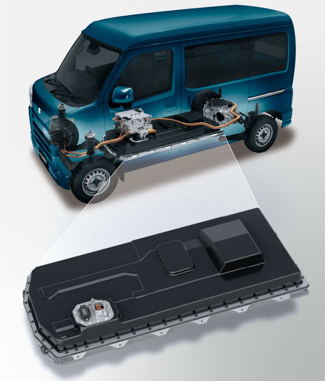 新型「e エブリイ」は、スズキ、ダイハツ工業、トヨタ自動車の3社で共同開発したBEVシステムを搭載した軽商用バンのEVモデル。