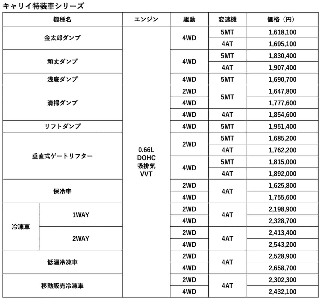 また、ぬかるみ脱出アシスト機能をデフロック付車※1にも追加し、ぬかるみからの脱出性能を一層高めている。その他、「キャリイ特装車」には、清掃ダンプの4WDに4ATの設定を追加した。
