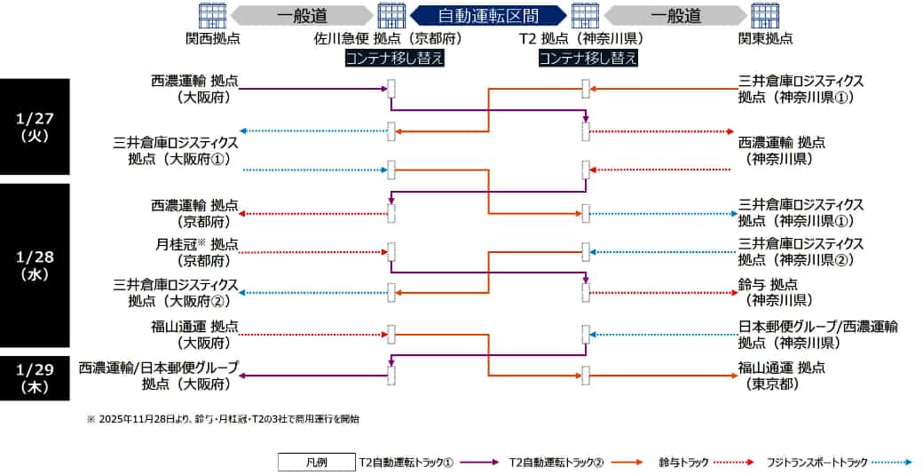 また今回は神奈川県厚木市と京都府八幡市にある物流施設をこれに見立てた上で、高速道路はT2のレベル2自動運転トラック( 2025年7月から開始した商用運行で使用 )、一般道は鈴与およびフジトランスポートのトラックで運行した。