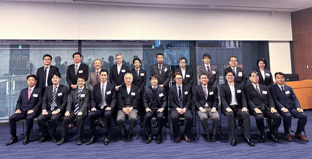 *全体会合に参加した代表者の集合写真(前列向かって左から)鈴与 松山取締役、三井倉庫ロジスティクス 松川取締役上級執行役員、日本郵便 五味執行役員、T2 熊部代表取締役CEO、敬愛大学 根本特任教授、国土交通省 物流・自動車局 物流政策課 内田課長補佐、国土交通省 物流・自動車局 企画・電動化・自動運転参事官室 庄司課長補佐、国土交通省 道路局 道路交通管理課 高度道路交通システム推進室 竹下室長、総務省 総合通信基盤局 電波部 移動通信課 新世代移動通信システム推進室 影井室長、西濃運輸 糀矢執行役員、フジトランスポート 松岡代表取締役 社長、(後列)三菱地所 岩田執行役常務、KDDI 小林執行役員、三菱ふそうトラック・バス 林取締役副社長、日本通運 丸尾ロジスティクス事業推進部長、佐川急便 事業開発部 佐藤部長、名鉄NX運輸 東京支社 田代部長、福山通運 営業本部 安全管理部 安全管理課 小山課長、日本貨物鉄道 髙橋執行役員、大林組 小平田執行役員、三井住友海上火災保険 佐久間常務執行役員