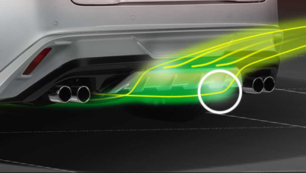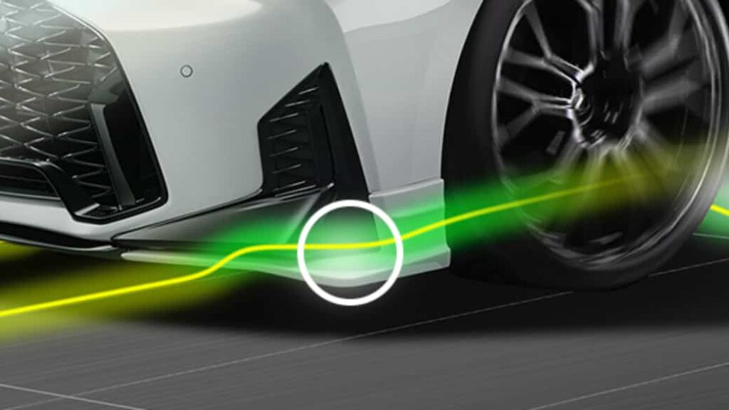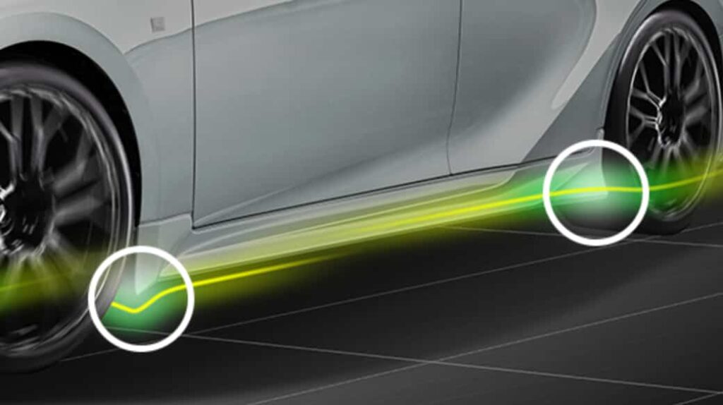 "F SPORT PARTS( TRD )"のフロントスポイラーは、スピンドルボディの流れをより一層躍動的かつ低重心にみせるデザインとし、コーナー部形状でリフトを低減させてFrタイヤの接地感を向上。それにより操縦の楽しさと静粛性に寄与。