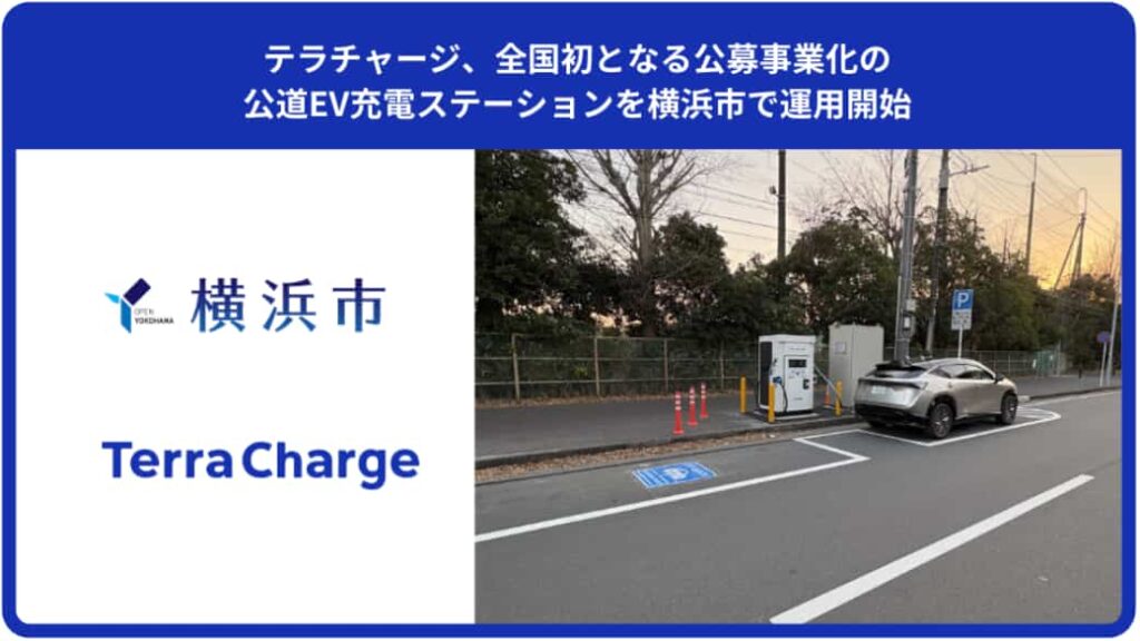 Terra Charge(本社:東京都港区、代表取締役社長:徳重 徹)は、横浜市が推進する脱炭素社会の実現に向けたEV充電インフラ整備の一環として、横浜市内の公道と公共施設3か所で、EV急速充電ステーションの運用を1月20日より開始した。