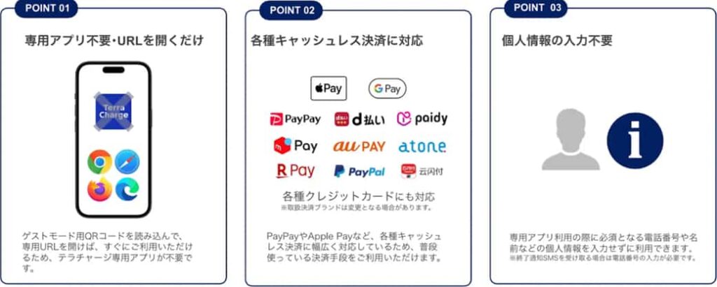利用にあたってはスマートフォンでQRコードを読み取り、アプリ不要のゲストモードで利用可能にしている。またEV充電アプリ「テラチャージ」をiOS版・Android版ともにリニューアルし、より直感的で使いやすいデザインと操作性を実現した。