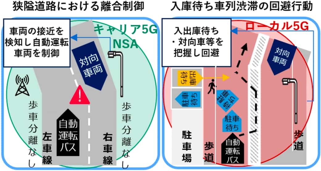 こうした背景を踏まえ、コンソーシアム関係各社は、通信制御(無線リソース最適化)と路 車協調(ローカル 5G・路側インフラ連携)を融合し、「都市部に於ける混雑発生地域や見通しの悪い狭あい道路でも安定して運行できる自動運転レベル4」の社会実装を目的とした検証を行う。