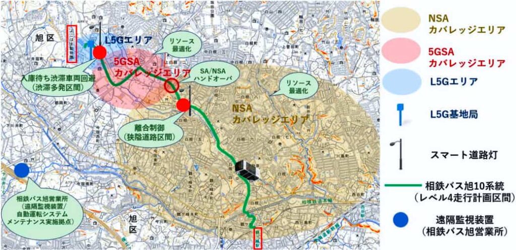 実証実験の概要は、同市内の混雑発生地域・狭あい道路に於いて、自動運転レベル4に関わるローカル5G、路側インフラを活用した自動運転走行支援、無線環境最適化に伴う車内遠隔監視などの実証を行う。