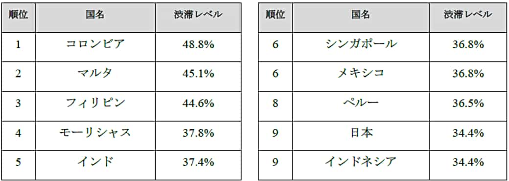 国別では、コロンビアが平均渋滞率約50%で首位となり、日本は約34%でインドネシアと並ぶ9位で、アジア地域ではフィリピン、インド、シンガポールに次ぐ4位の結果となっている。