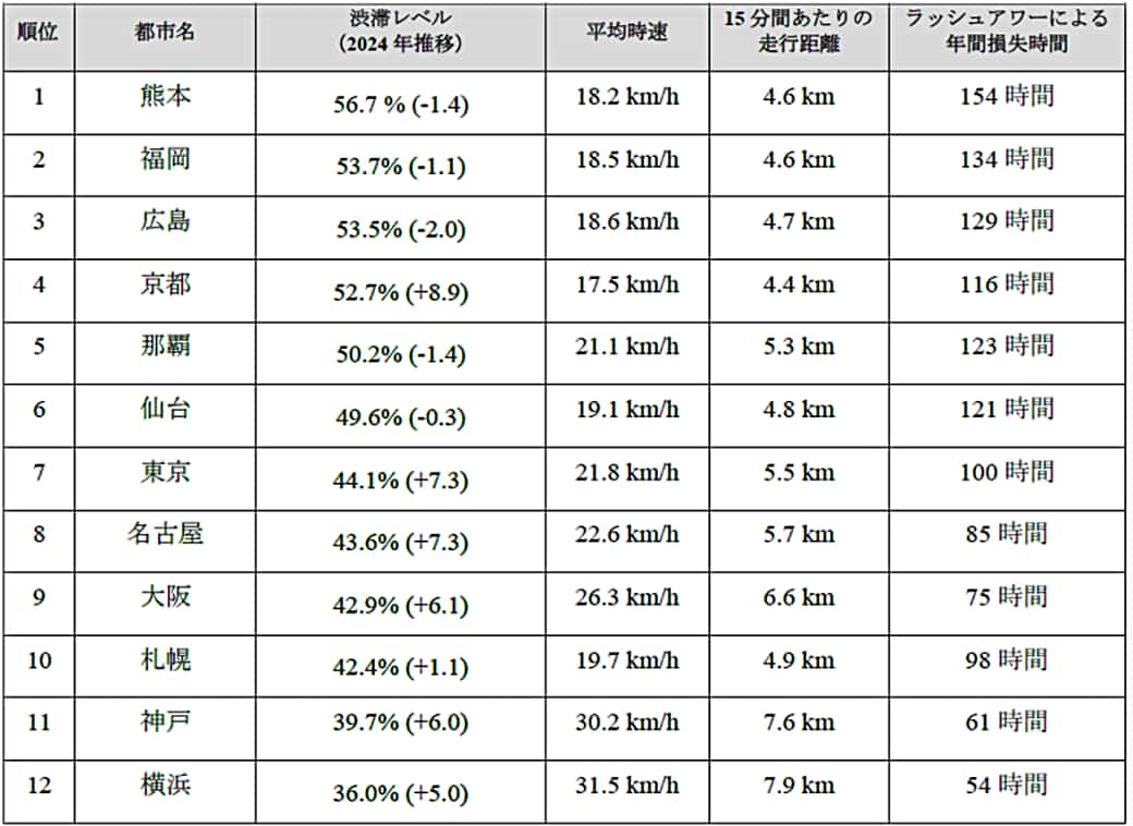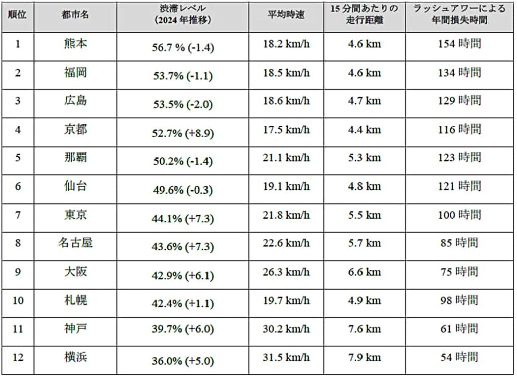 2025年、トムトムは日本国内の主要12都市を対象に交通データの詳細な分析を実施した。各都市に於ける渋滞レベル、平均時速、15分間あたりの走行距離、およびラッシュアワーによる年間損失時間の結果は下記の通り。