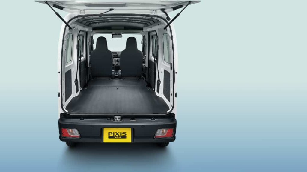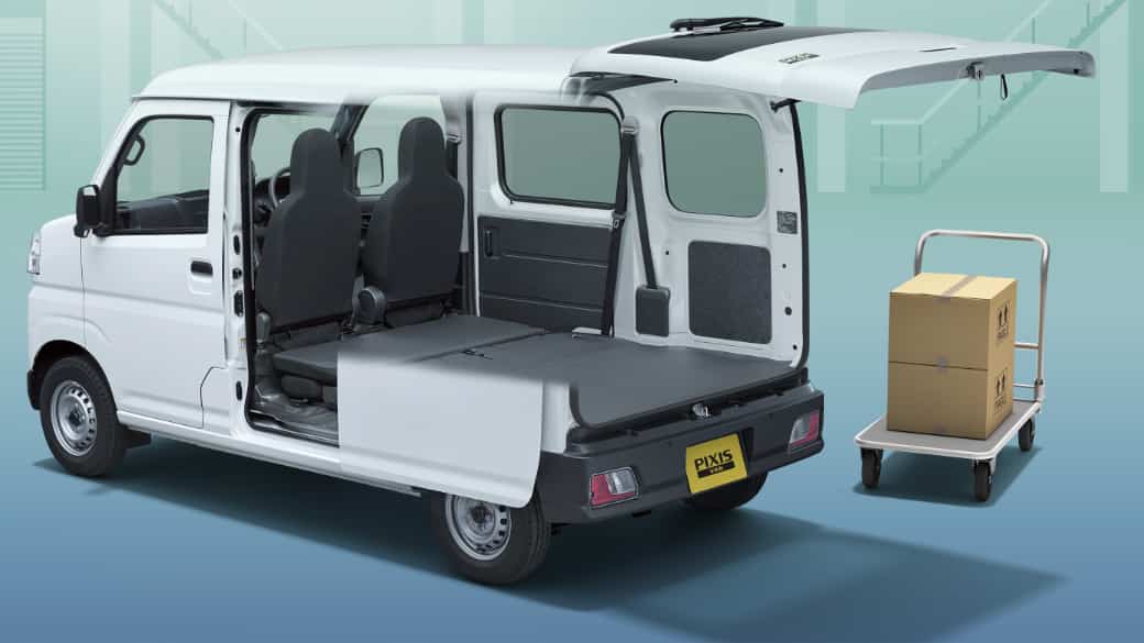 – ピクシス バン(ガソリン車)同等の荷室空間を確保するとともに、最大積載量350kgを確保。軽キャブオーバーバンNo.1の積載スペース(荷室長1,920mm×荷室幅1,270mm×荷室高1,250mm)に加え、積み下ろしがしやすい荷室フロア地上高630mmを実現。さらに、空間を有効活用した頭上収納「オーバーヘッドシェルフ」や汚れても水拭き可能な「撥水機能付フルファブリックシート表皮」を採用するなど働くクルマとしての使い勝手の良さを追求した。