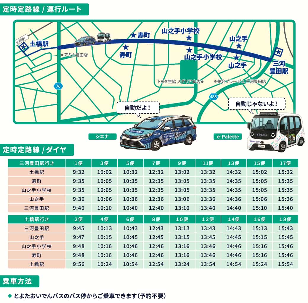 また、定時定路線では、自動走行する車両の後方を、手動運転の「e-Palette」(乗客定員:10人)が追従走行する形で運行する。