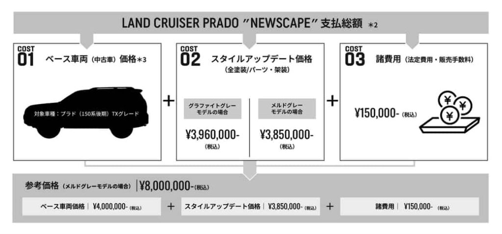 LAND CRUISER PRADO “NEWSCAPE”の販売価格は、ベース車両の価格に、全塗装やパーツ・架装等に掛かるスタイルアップデート価格、オールペイント塗装品質保持のために必要な加修費用、法定費用や販売手数料等の諸費用が加算された額となる。