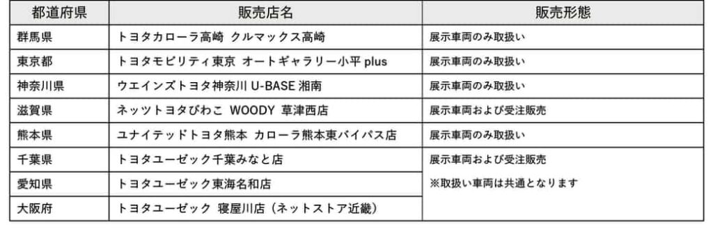 以下のCORDE by 商品取扱い販売店のみでの販売となる。中古車をベース車としているため、販売店毎に車両仕様(年式/走行距離など)が異なり、発売時点での展示車両の台数も異なる。取扱店舗毎の取扱台数、車両仕様、販売方法など詳細情報は2月初旬より順次公開するため公式サイトやInstagramにて確認されたい。