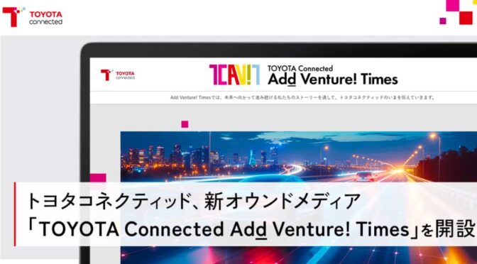 ちなみにメディア名の「TOYOTA Connected Add Venture! Times」は、ベンチャー企業として歩みを始めたトヨタコネクティッドの原点の「加える・拡げる」という意味の「Add」を掛け合わせた造語としている。