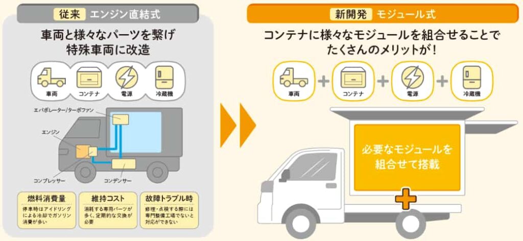 各機能が分離構造の今製品は、故障時の原因特定が容易であり、かつ冷蔵機や電源を交換可能な仕組にすることで復旧までに要する時間を短縮。移動販売事業の迅速な再開に寄与する。