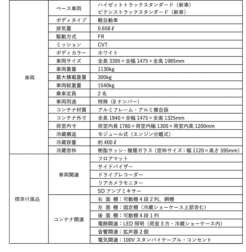 しかし『いちばキャビン』では冷蔵装置に株式会社デンソーの小型モバイル冷凍機『D-mobico』を採用し、ポータブルバッテリーを動力源とすることでアイドリングを不要とした。