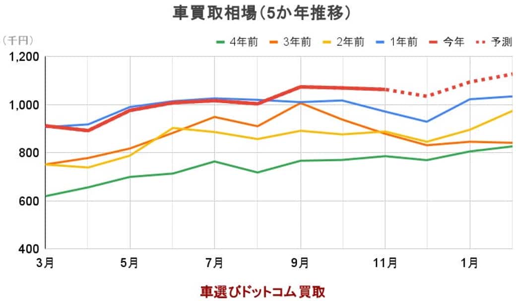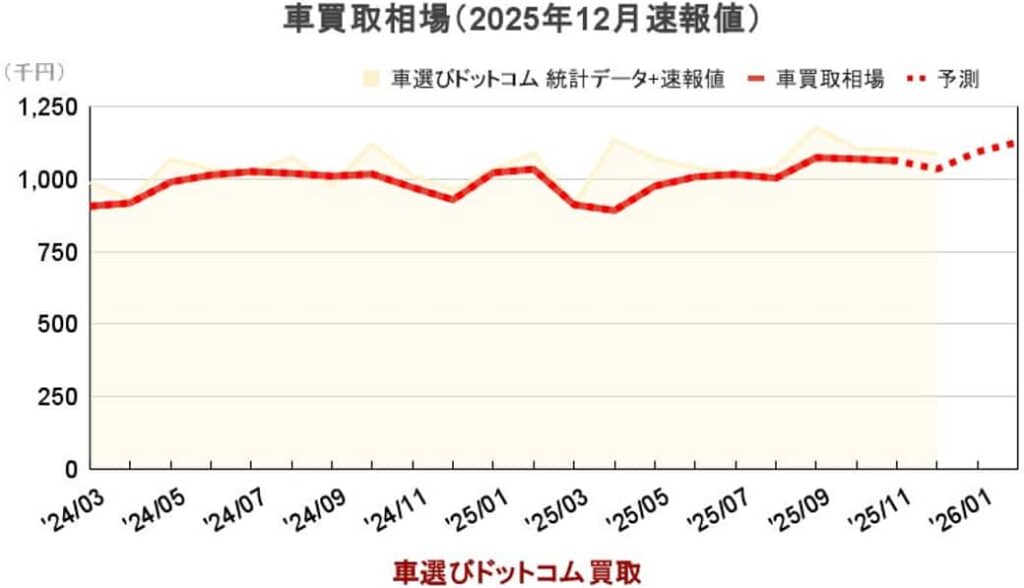 車選びドットコムが集計した独自データによると、年末にかけては例年通り一時的な落ち着きが見られるものの、その後は春先の中古車需要に備えた仕入れ強化の動きが進み、買取相場は再び高水準で推移する可能性が高いと見ている。