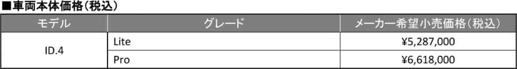 また「ID.4」はフォルクスワーゲンの電気自動車専用アーキテクチャー「モジュラー エレクトリックドライブ マトリックス」(MEB)をベースとしているため、大容量のバッテリー搭載による長い航続距離と、広々とした室内空間、低重心ならびにリヤモーターリヤ駆動レイアウトによるダイナミックなドライビングなどが市場から好評を得ているとしている。