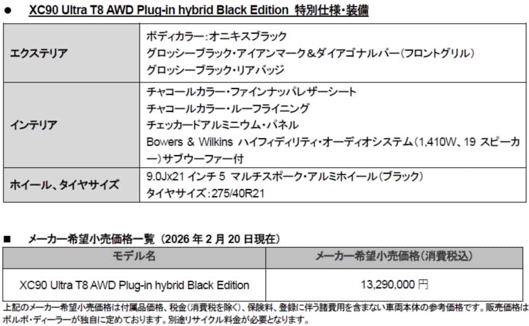 同社では、「T8 AWD Plug-in hybridパワートレーンと電動制御式4輪エア・サスペンションがもたらすシリーズ最高峰の卓越したパフォーマンスに、存在感際立つブラックカラーテーマを融合させたXC90 Black Editionは、走りと質感の両面においてフラッグシップの名にふさわしい特別な価値を備えたモデルです」と謳っている。