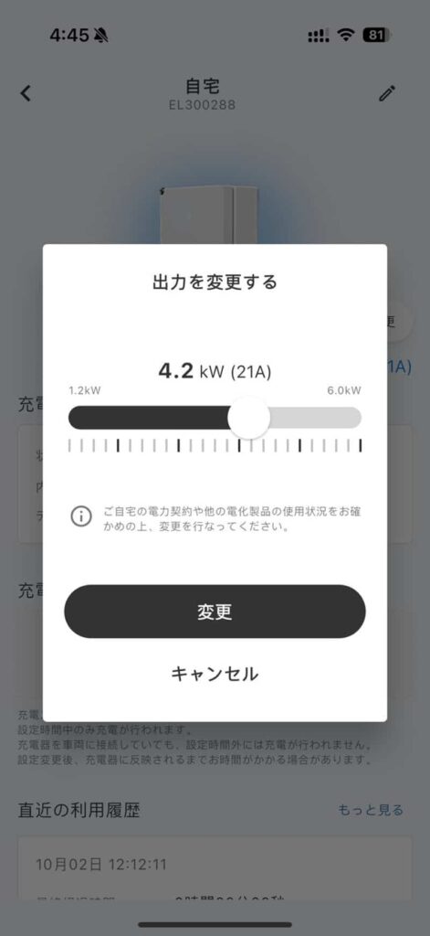 一般家庭の電力契約(40A〜50Aが主流)では、家電との併用でブレーカーが落ちることがある。アプリで出力を調整することで、契約アンペアを変更せずに安全に充電できる。